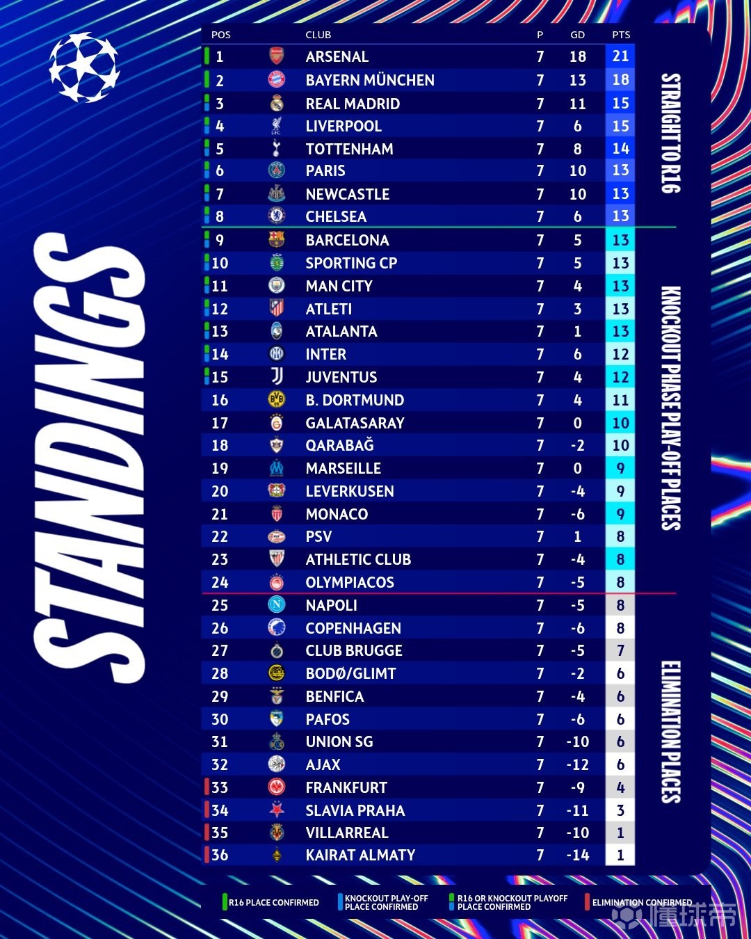 欧冠前7轮,加拉塔萨雷取得了3胜1平3负的战绩,击败了利物浦、博德闪耀、阿贾克斯,排名第17位、积10分的格局让他们有较大可能拿到附加赛席位。