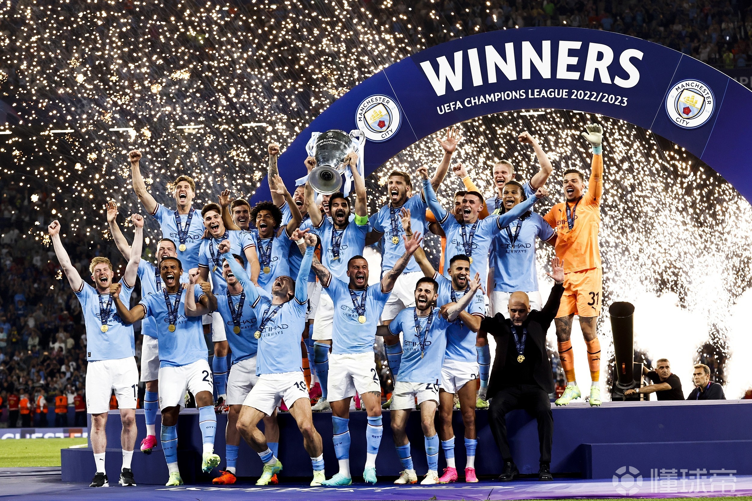 足总杯决赛的曼市德比,京多安12秒破门创足总杯决赛最快进球纪录,这粒进球也被曼城球迷评选为赛季最佳进球,京多安再次完成梅开二度,帮助曼城2-1击败曼联,赢得足总杯冠军。欧冠决赛,曼城1-0击败国米加冕三冠王,京多安作为队长捧起大耳朵杯,这一幕也代表着曼城俱乐部的历史巅峰。