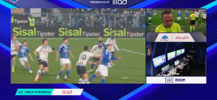 第90+5分钟,斯卡尔维尼手球,裁判观看VAR判罚点球