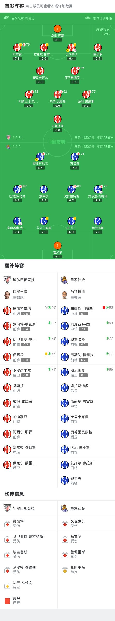 北京时间2月2日西班牙足球甲级联赛 联赛 第22轮,毕尔巴鄂竞技主场对阵皇家社会。毕尔巴鄂竞技德加拉雷塔破门。皇家社会贡萨洛-格德斯破门。最终比分毕尔巴鄂竞技 1-1 皇家社会。