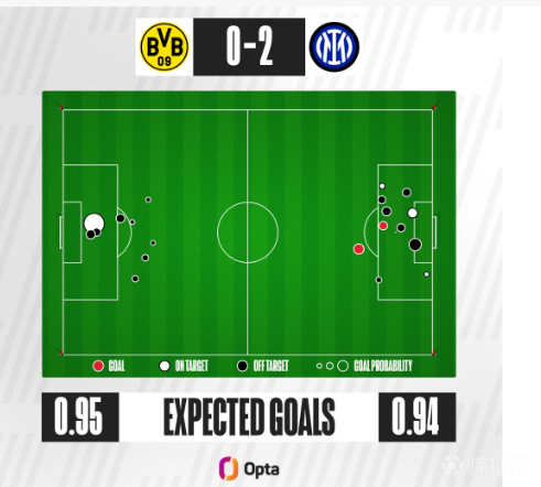 从全场的预期进球方面来看,两队均为0.94,显示出双方在创造机会上的相似性,但吉拉西的这一次禁区内射门就占了0.54,其他8脚射门多数在0.05上下,而国际米兰进球预期则比较平均在0.08左右,相比多特蒙德,国米显然在把握机会方面更加高效。
