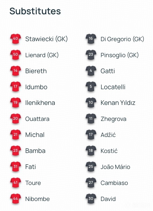 替补:4-加蒂、5-洛卡特利、10-伊尔迪兹、11-热格罗瓦、16-迪格雷戈里奥、17-阿季奇、18-科斯蒂奇、23-平索利奥、25-马里奥、27-坎比亚索、30-戴维