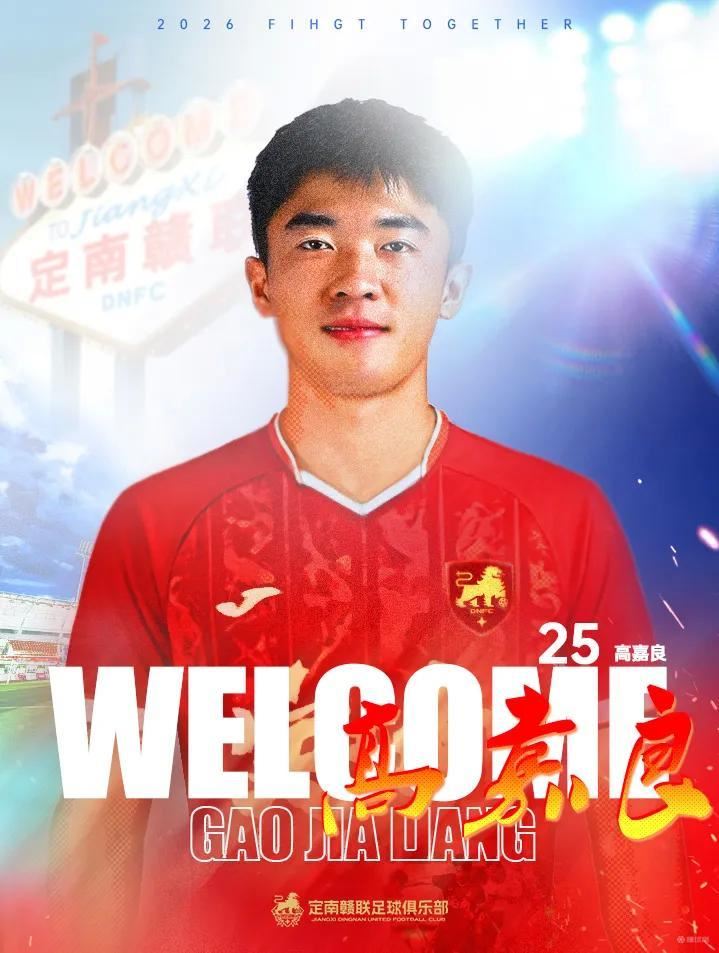 2026赛季高嘉良转会定南赣联,将身穿25号球衣代表定南赣联参加中甲联赛,欢迎高嘉良加入定南赣联足球俱乐部。