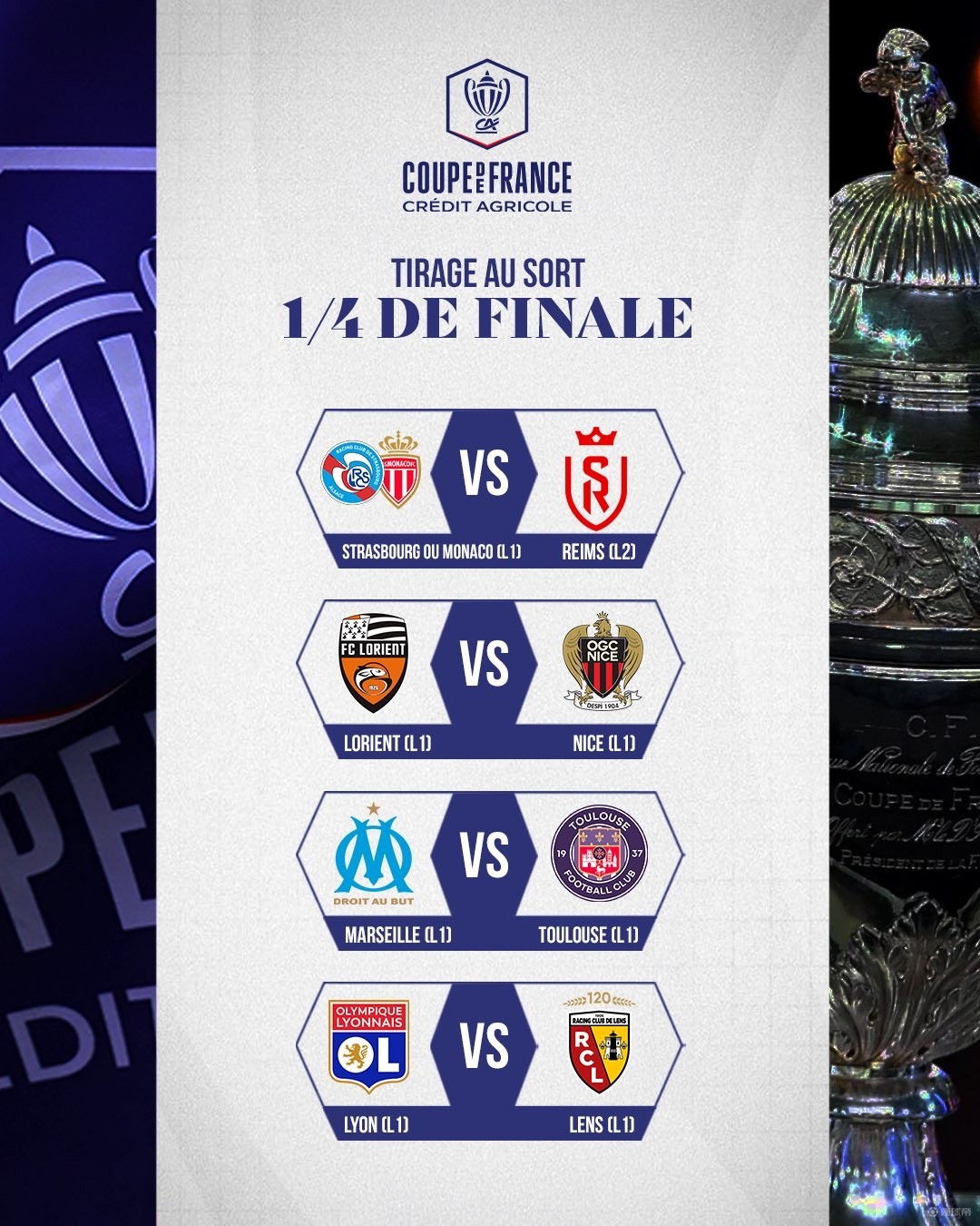 法国杯八强对阵:马赛vs图卢兹,里昂vs朗斯