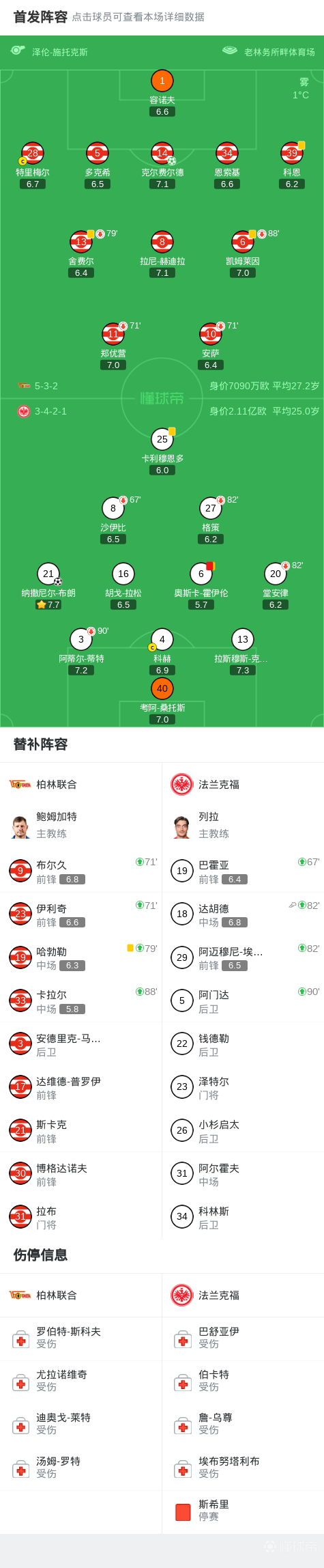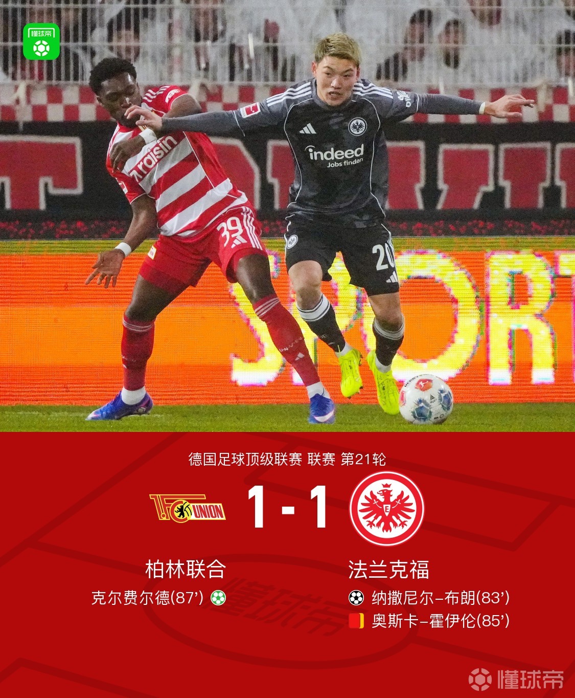 北京时间2月7日德国足球顶级联赛 联赛 第21轮,柏林联合主场对阵法兰克福。柏林联合克尔费尔德破门。法兰克福纳撒尼尔-布朗破门。最终比分柏林联合 1-1 法兰克福。