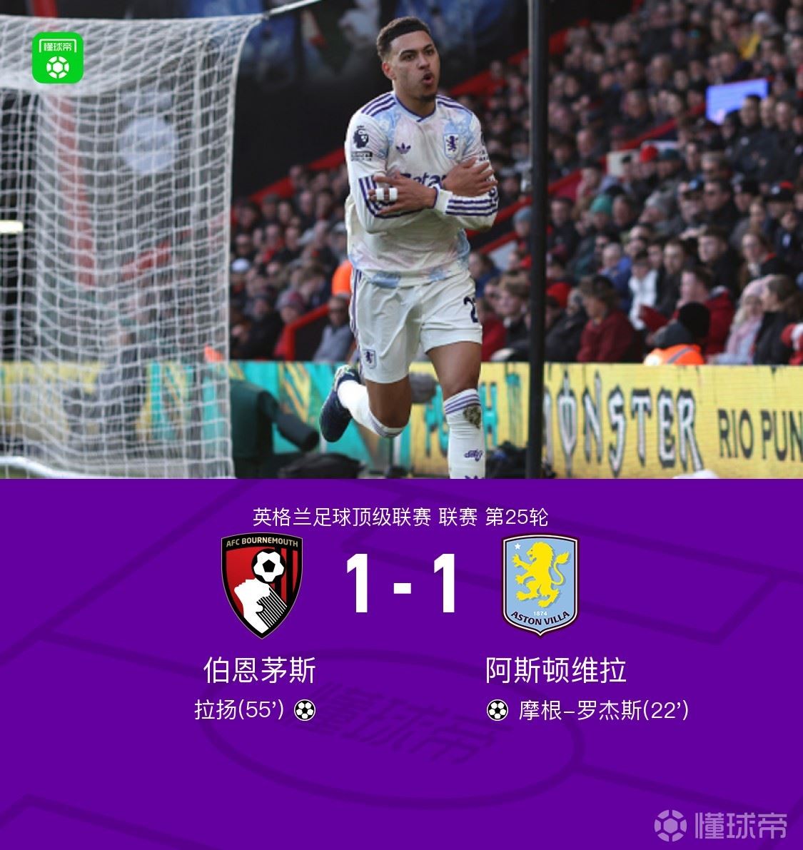 伯恩茅斯1-1维拉,摩根-罗杰斯建功,拉扬扳平