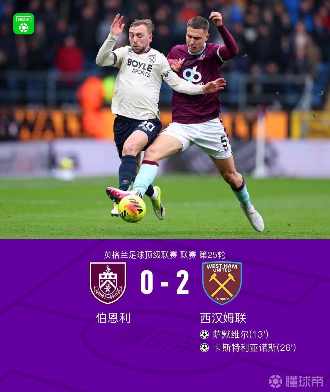 北京时间2月7日英格兰足球顶级联赛 联赛 第25轮,伯恩利主场对阵西汉姆联。上半场西汉姆联萨默维尔破门首开记录,随后卡斯特利亚诺斯头槌破门扩大领先优势。最终比分伯恩利 0-2 西汉姆联。