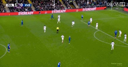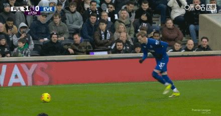 第75分钟,霍尔中路抢点,低射扳平比分,富勒姆1-1埃弗顿