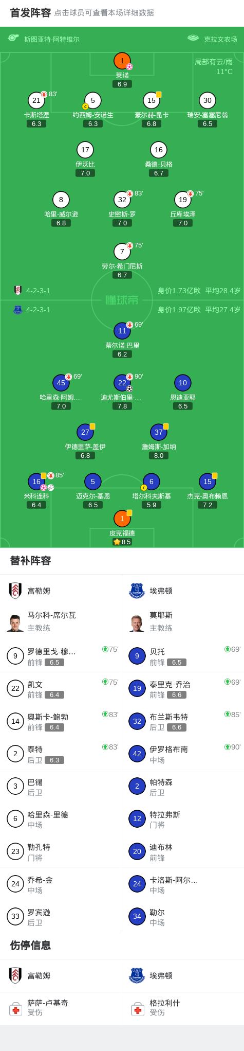 埃弗顿2-1逆转富勒姆,霍尔建功,米科连科、莱诺乌龙