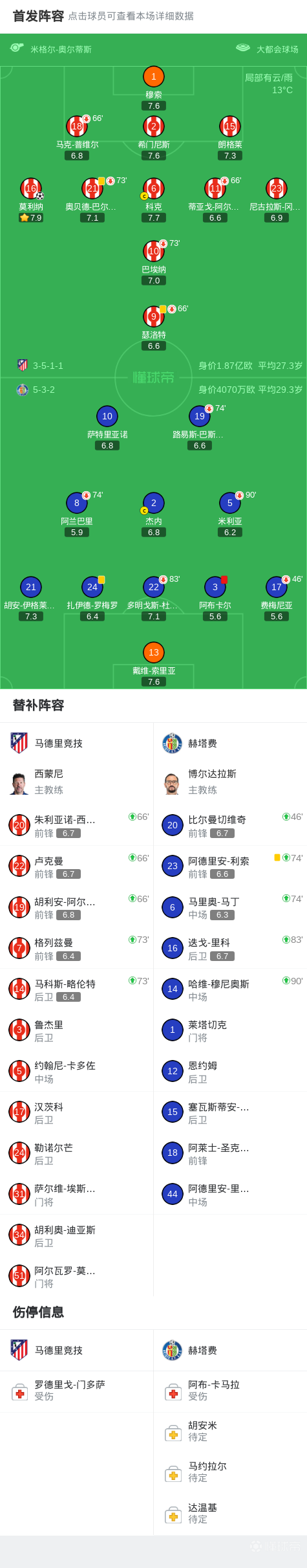 马竞1-0十人赫塔费,莫利纳轰出无解世界波,阿布卡尔染红